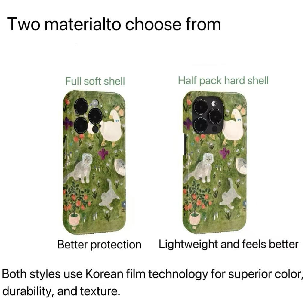 • Description :Bring joy to your day with this whimsical phone case featuring a hand-drawn garden scene filled with playful cats, a friendly duck, and blooming flowers. The soft green backdrop and charming illustration create a peaceful countryside vibe. Ideal for animal lovers and fans of cozy cottagecore aesthetics, this CaseMuses design combines cuteness with lightweight protection.