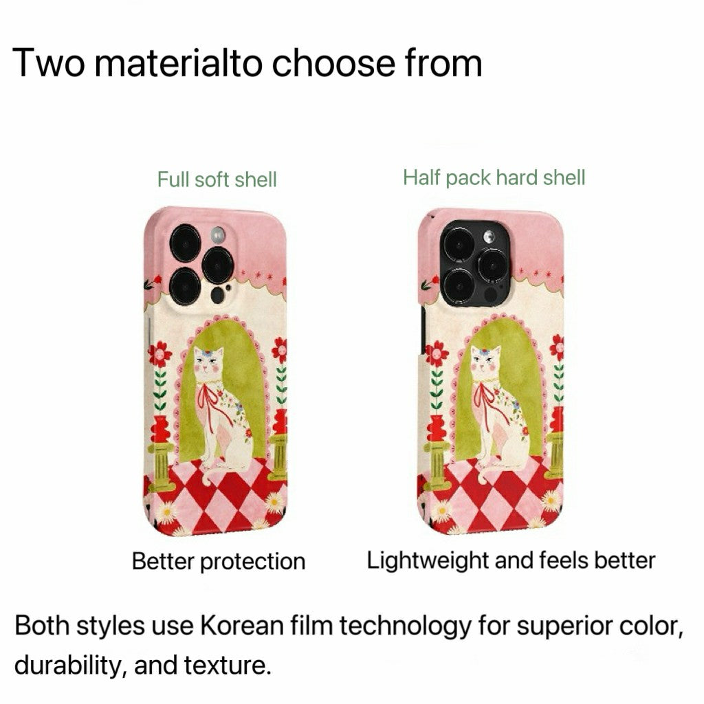 • Description : A regal white cat with floral details sits poised in a charming fairytale setting. This phone case blends vintage decor with whimsical charm, printed using premium Korean film for vivid color and fine texture.